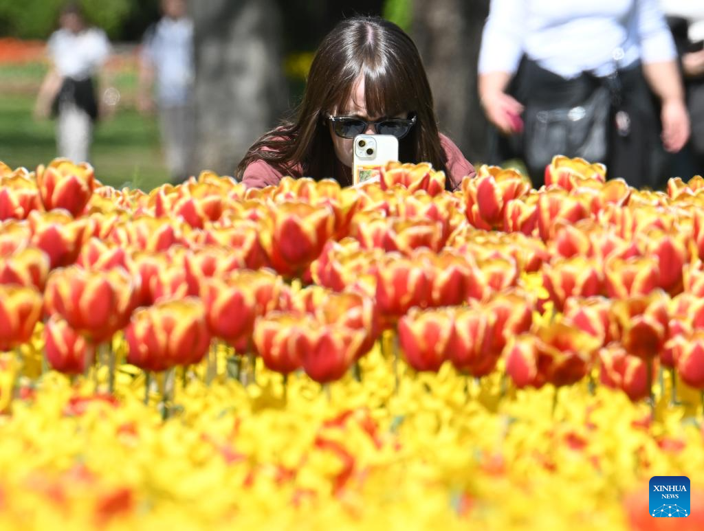 A woman takes photos of blooming flowers at a park in Valeggio sul Mincio, Verona, Italy, April 4, 2026. (Photo by Alberto Lingria/Xinhua)