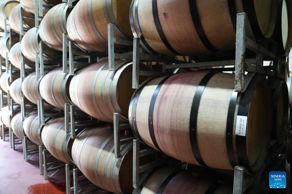 Oak barrels are seen at the production facility of Diemersdal Wine Estate in Durbanville, Cape Town, South Africa, on March 31, 2026. (Xinhua/Wang Lei)