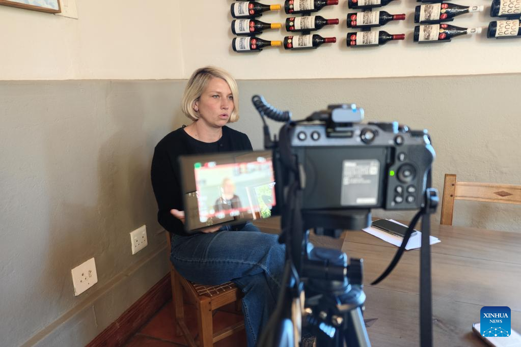 This photo taken with a mobile phone shows Steffi Layer, the Diemersdal Wine Estate's international marketing and sales manager, receiving an interview with Xinhua in Durbanville, Cape Town, South Africa, on March 31, 2026. (Xinhua/Deng Bingxue)