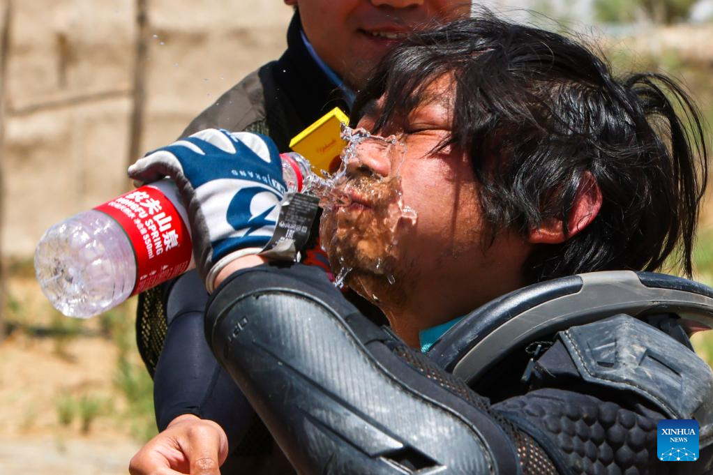 Zhang Xue drinks water after crossing the finishing line during the 2023 Taklimakan Rally in Yutian County of Hotan Prefecture, northwest China's Xinjiang Uygur Autonomous Region, on May 29, 2023. (Xinhua/Hao Zhao)