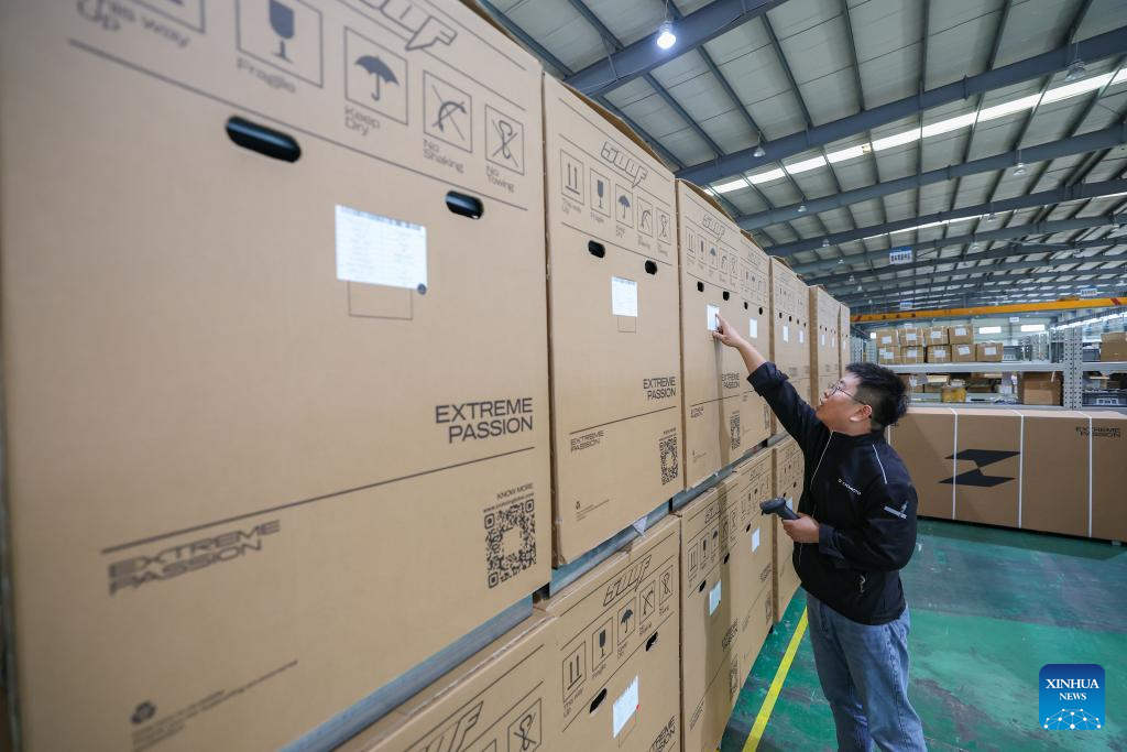 An employee transports motorcycles to be shipped at ZXMOTO in Liangjiang New Area, southwest China's Chongqing, on April 1, 2026. (Xinhua/Huang Wei)