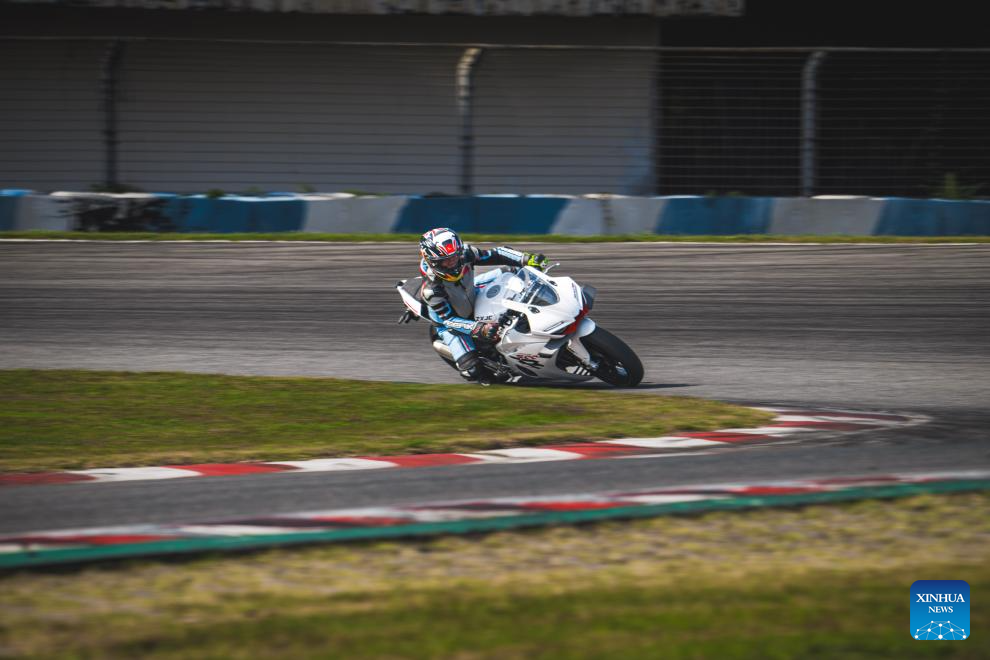 Zhang Xue test-drives a motorcycle at Zhuhai International Circuit in Zhuhai, south China's Guangdong Province, on Jan. 16, 2025. (Xinhua)