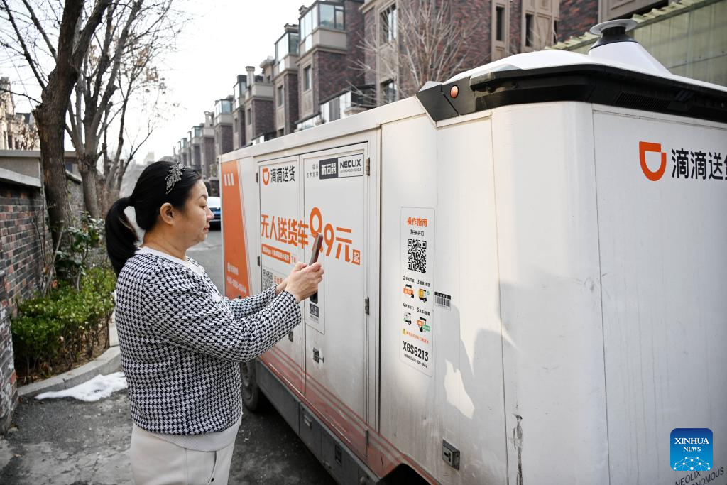 Zhou Li scans a QR code with her mobile phone to collect her order delivered by an unmanned delivery vehicle at her residential compound in Chengyang District, Qingdao, east China's Shandong Province, Jan. 28, 2026. (Xinhua/Li Ziheng)