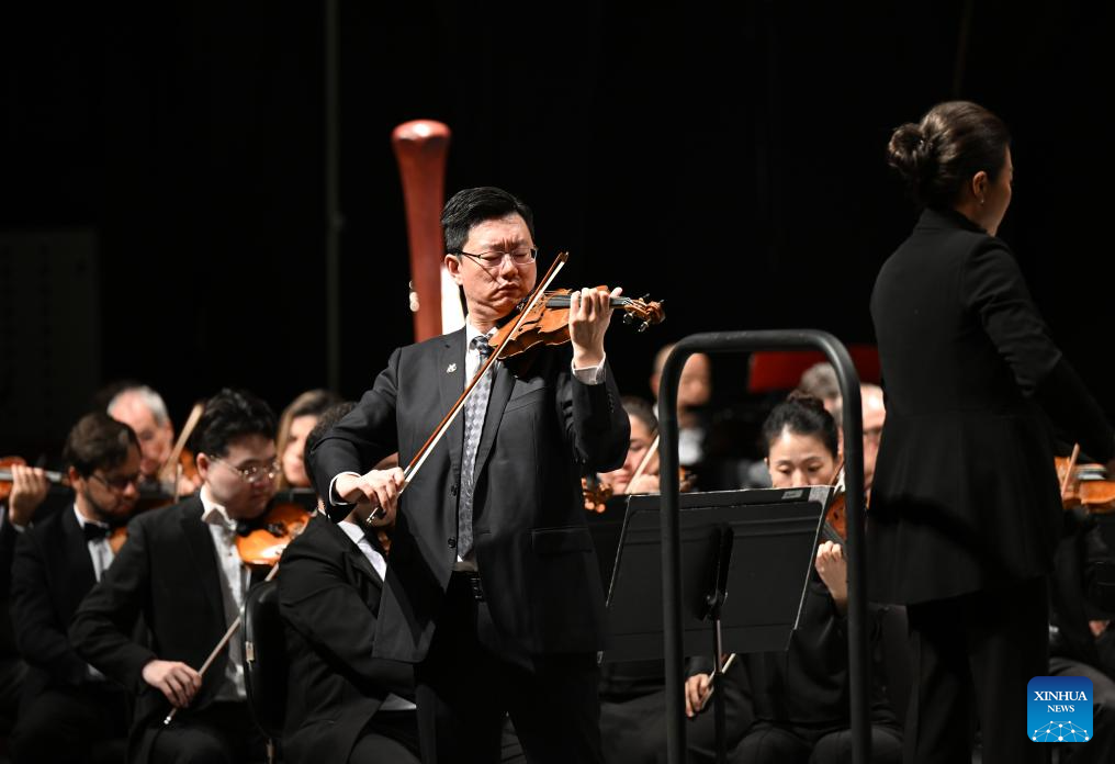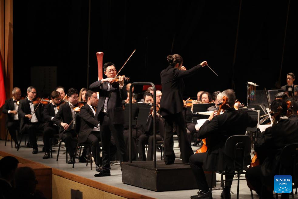 Chinese violinist Yao Liang from the China National Symphony Orchestra performs during the "China-Brazil Cultural Year" concert held at the FHE Poupex theatre in Brasilia, Brazil, April 7, 2026. The "China-Brazil Cultural Year" concert opened here on Tuesday. Jointly presented by the China National Symphony Orchestra and the Claudio Santoro National Theater Symphony Orchestra from Brazil, it showcased the cultural charm of both countries through a dialogue of music. (Xinhua/Jin Haoyuan)
