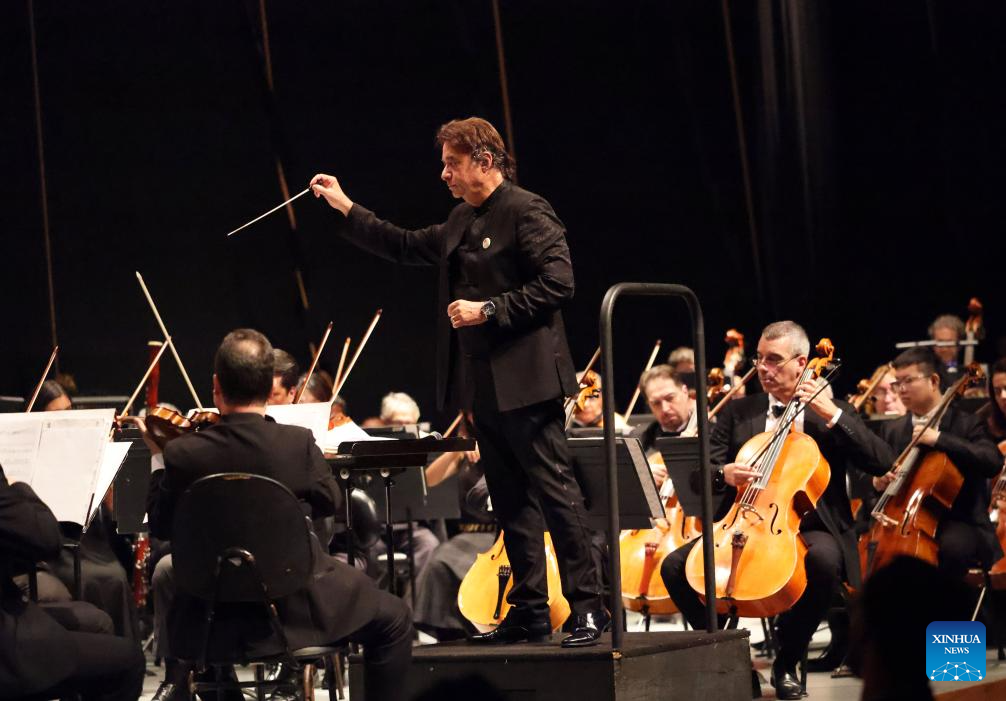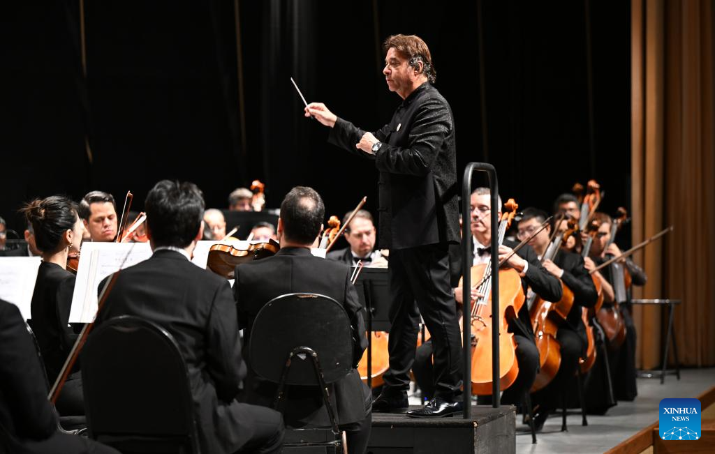 Brazilian conductor Claudio Cohen is pictured during the "China-Brazil Cultural Year" concert held at the FHE Poupex theatre in Brasilia, Brazil, April 7, 2026. The "China-Brazil Cultural Year" concert opened here on Tuesday. Jointly presented by the China National Symphony Orchestra and the Claudio Santoro National Theater Symphony Orchestra from Brazil, it showcased the cultural charm of both countries through a dialogue of music. (Xinhua/Jin Haoyuan)