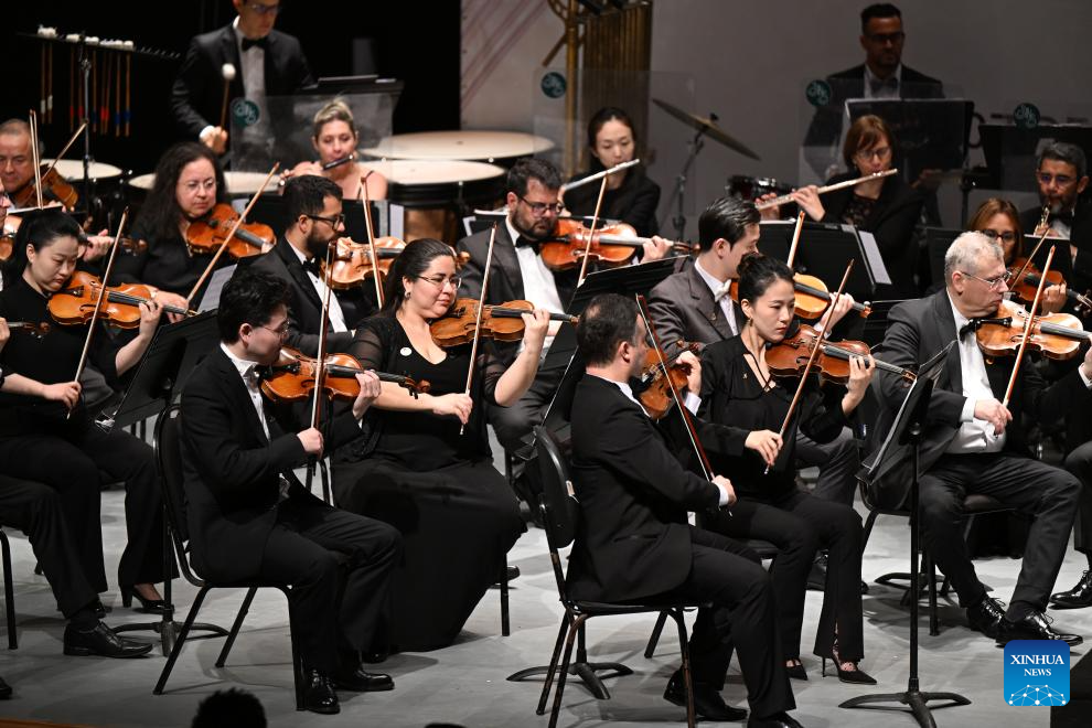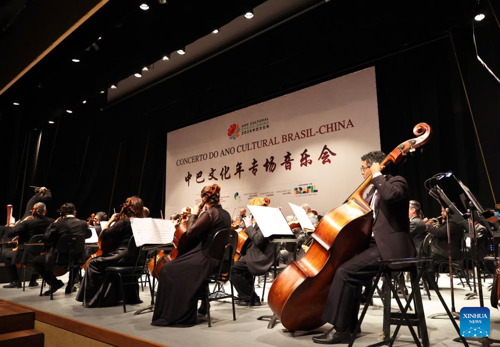 Musicians perform during the "China-Brazil Cultural Year" concert held at the FHE Poupex theatre in Brasilia, Brazil, April 7, 2026. The "China-Brazil Cultural Year" concert opened here on Tuesday. Jointly presented by the China National Symphony Orchestra and the Claudio Santoro National Theater Symphony Orchestra from Brazil, it showcased the cultural charm of both countries through a dialogue of music. (Xinhua/Jin Haoyuan)