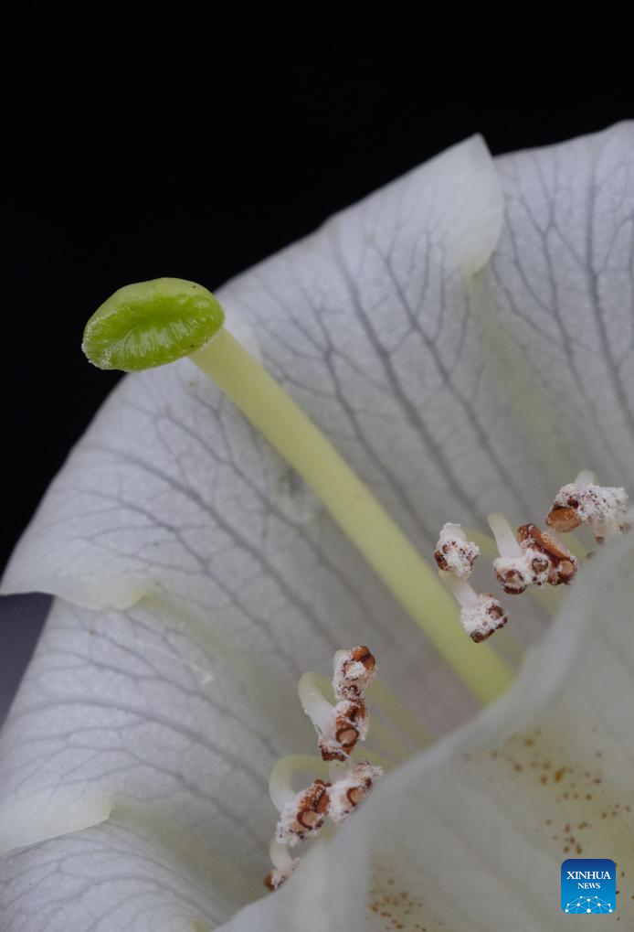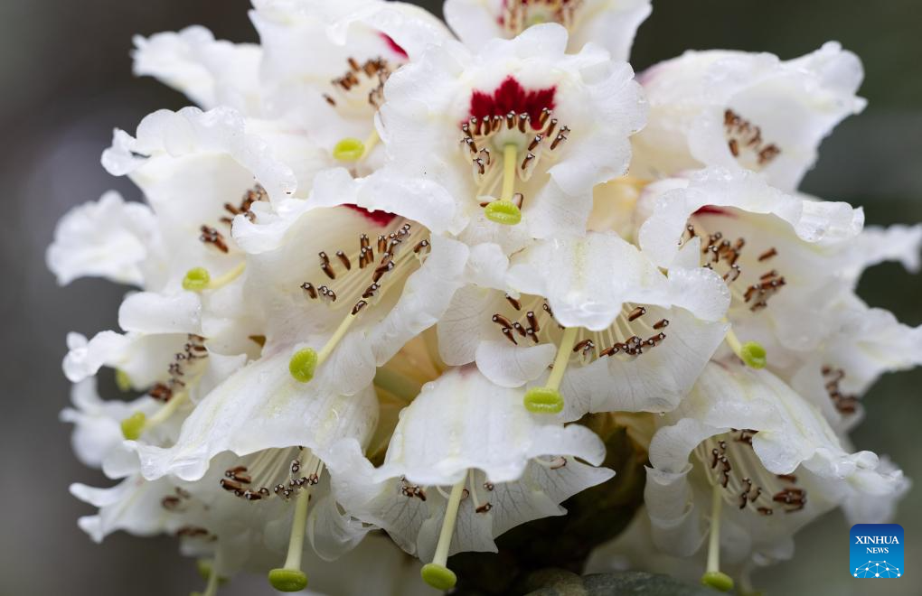 This photo taken with a macro lens on April 8, 2026 shows the stamen and pistil of a blooming Rhododendron sinogrande at the West China Subalpine Botanical Garden in Chengdu, southwest China's Sichuan Province. A batch of Rhododendron sinogrande, an alpine rhododendron species, recently bloomed for the first time here after 29 years of artificial cultivation.