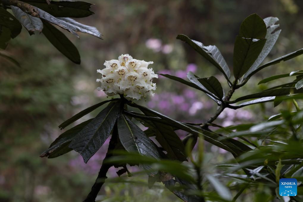 This photo taken on April 8, 2026 shows blooming Rhododendron sinogrande at the West China Subalpine Botanical Garden in Chengdu, southwest China's Sichuan Province. A batch of Rhododendron sinogrande, an alpine rhododendron species, recently bloomed for the first time here after 29 years of artificial cultivation.