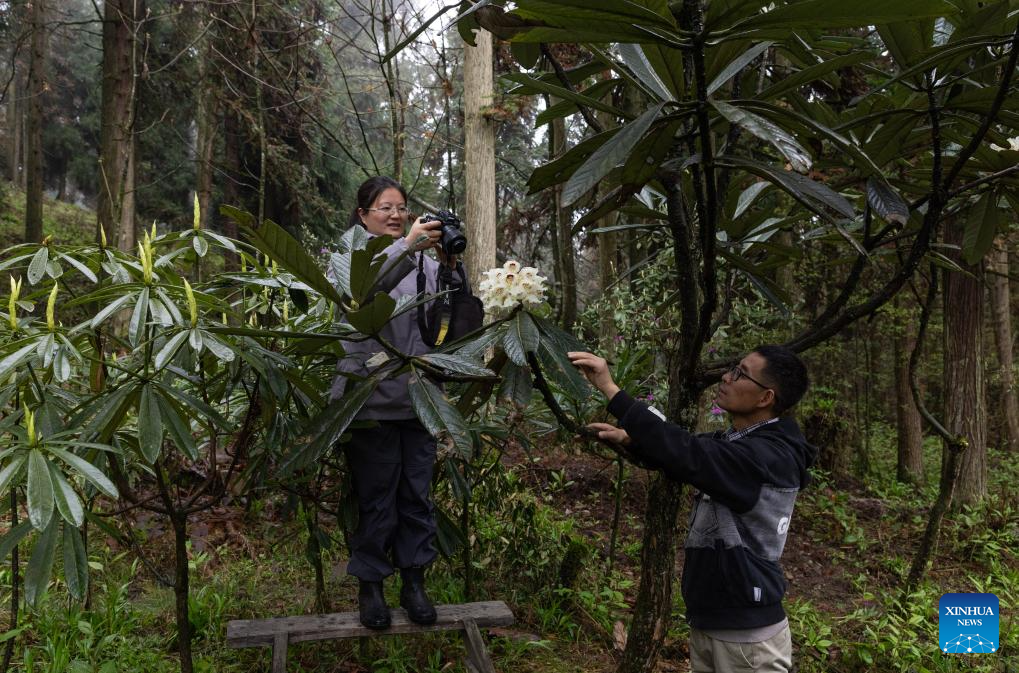 Researchers Wang Fei and Shao Huimin (L) record the condition of blooming Rhododendron sinogrande at the West China Subalpine Botanical Garden in Chengdu, southwest China's Sichuan Province, April 8, 2026. A batch of Rhododendron sinogrande, an alpine rhododendron species, recently bloomed for the first time here after 29 years of artificial cultivation.