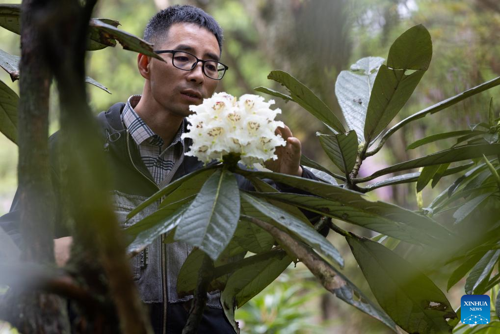 Researcher Wang Fei checks blooming Rhododendron sinogrande at the West China Subalpine Botanical Garden in Chengdu, southwest China's Sichuan Province, April 8, 2026. A batch of Rhododendron sinogrande, an alpine rhododendron species, recently bloomed for the first time here after 29 years of artificial cultivation.