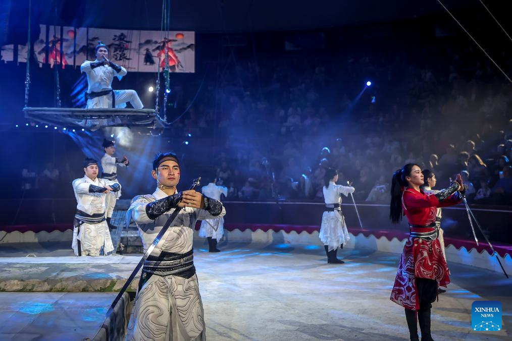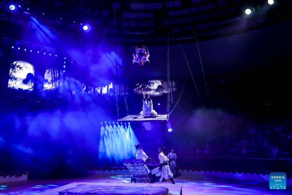Members of China's Jiangsu Acrobatic Troupe perform in "Soaring Above the Waves," an acrobatic act combining teeterboard, trampolines and a rocking platform, during the "Ringlispil" circus show at the Capital Circus of Budapest in Budapest, Hungary, April 8, 2026. Featuring acrobatic masters from various countries, the "Ringlispil" circus show takes place here from April 4 to 12. (Photo by David Balogh/Xinhua)