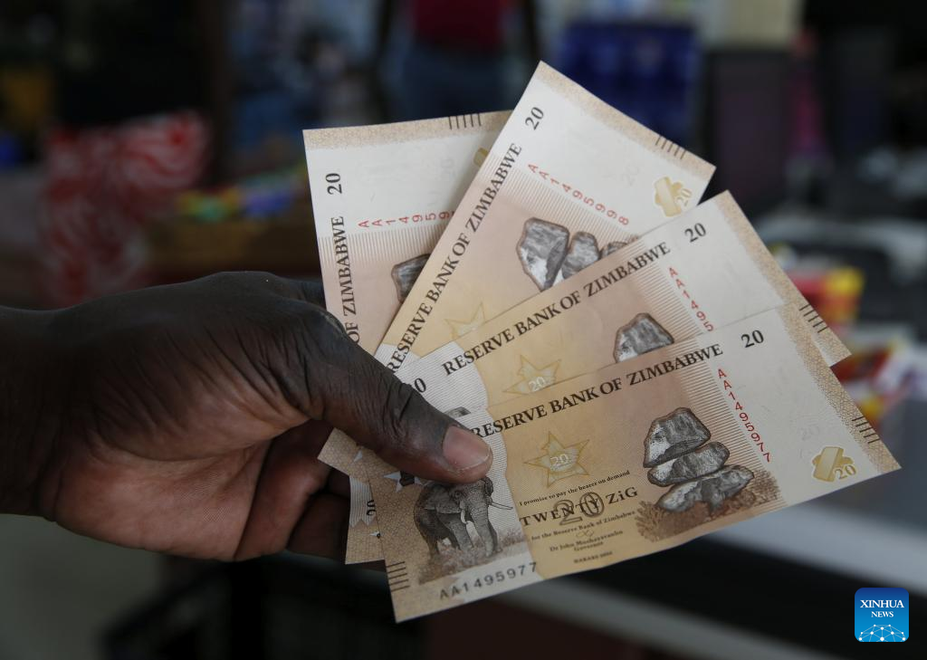 A man checks on a newly issued Zimbabwe Gold (ZiG) banknote at a tuck shop in Marondera in Mashonaland East Province, Zimbabwe on April 9, 2026. Zimbabwe officially commenced the injection of the new Zimbabwe Gold (ZiG) banknotes into the market on Tuesday. The currency entered full circulation as the new ZiG10, ZiG20, and ZiG50 denominations were disbursed through ATMs and banking halls in major cities, including Harare and Bulawayo. (Photo by Shaun Jusa/Xinhua)