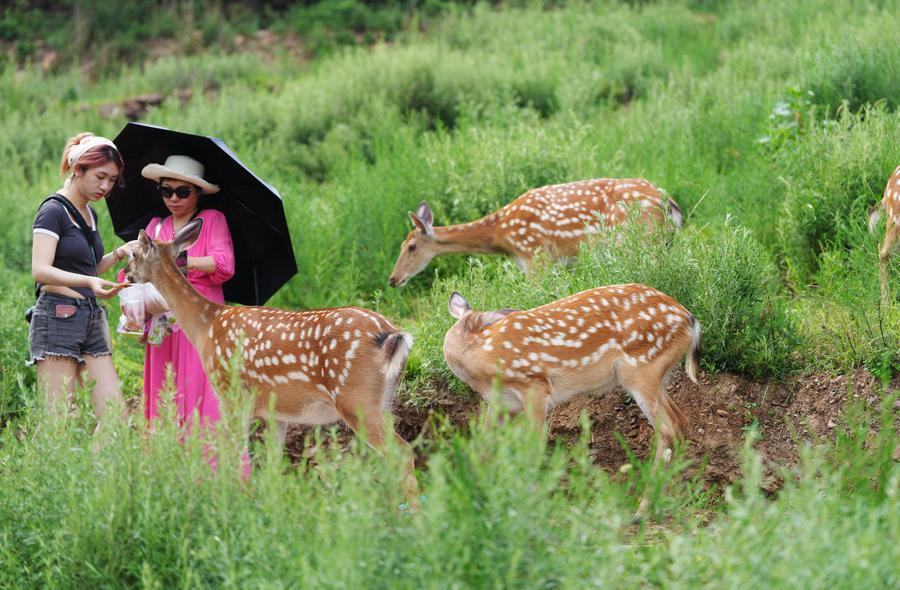 People interact with sika deer in Dalian, northeast China's Liaoning Province, July 18, 2025. (Xinhua/Li Gang)