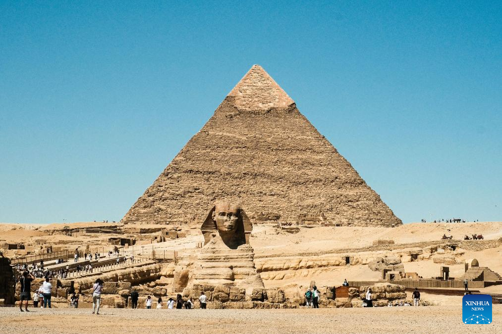 Tourists visit the Sphinx in the Giza Pyramids scenic spot in Giza, Egypt, April 9, 2026. The Giza Pyramids located southwest of Cairo, capital of Egypt, are one of the most representative sites of ancient Egyptian civilization. The complex includes the three pyramids known as the Great Pyramids, the massive sculpture known as the Great Sphinx, and several ancient cemeteries and smaller pyramids. The pyramids are part of a UNESCO World Heritage Site inscribed in 1979. (Xinhua/Xin Mengchen)