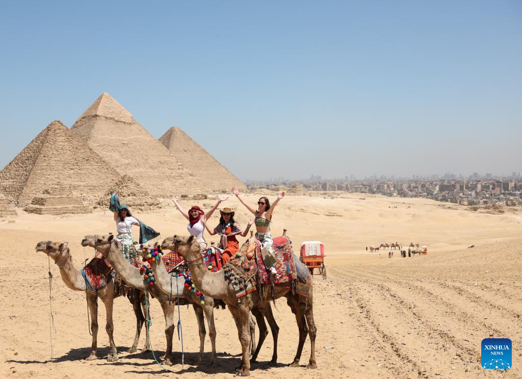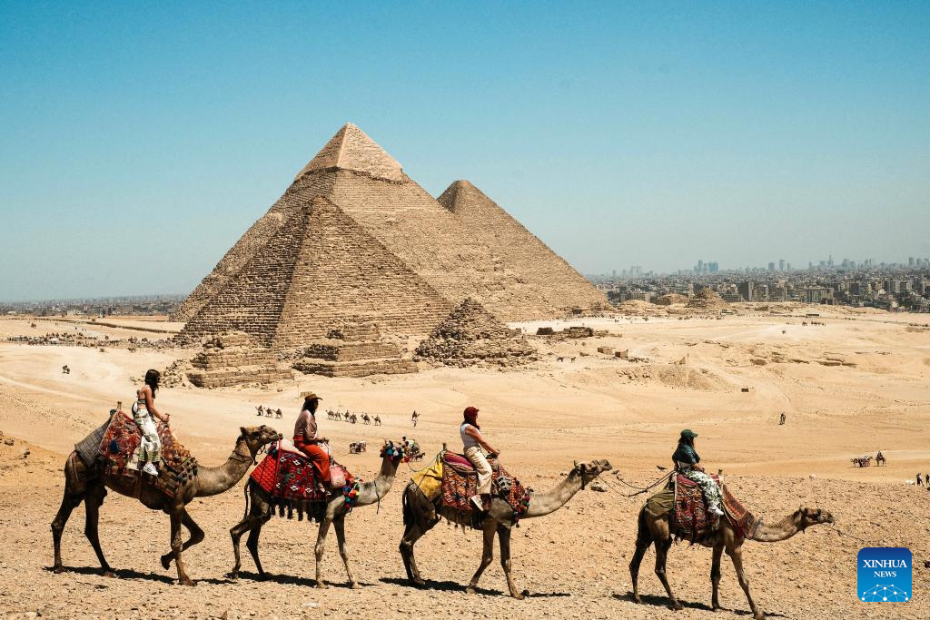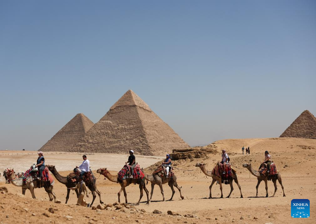 Tourists ride camels in the Giza Pyramids scenic spot in Giza, Egypt, April 9, 2026. The Giza Pyramids located southwest of Cairo, capital of Egypt, are one of the most representative sites of ancient Egyptian civilization. The complex includes the three pyramids known as the Great Pyramids, the massive sculpture known as the Great Sphinx, and several ancient cemeteries and smaller pyramids. The pyramids are part of a UNESCO World Heritage Site inscribed in 1979. (Xinhua/Xin Mengchen)