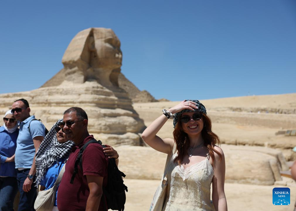 Tourists pose for photos with the Sphinx in the background in the Giza Pyramids scenic spot in Giza, Egypt, April 9, 2026. The Giza Pyramids located southwest of Cairo, capital of Egypt, are one of the most representative sites of ancient Egyptian civilization. The complex includes the three pyramids known as the Great Pyramids, the massive sculpture known as the Great Sphinx, and several ancient cemeteries and smaller pyramids. The pyramids are part of a UNESCO World Heritage Site inscribed in 1979. (Xinhua/Zhang Haobo)