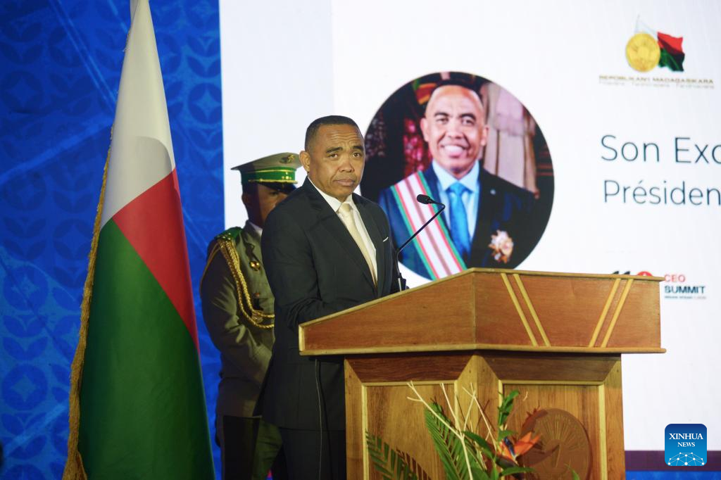 Madagascar's President Michael Randrianirina delivers a speech at the opening ceremony of the second edition of the CEO Summit Indian Ocean in Antananarivo, capital of Madagascar, April 9, 2026. (Photo by Sitraka Rajaonarison/Xinhua)