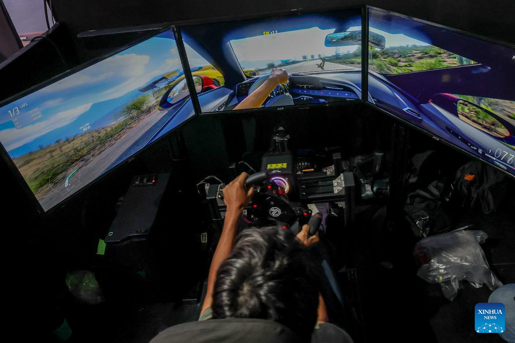 A boy plays a racing video game during the Manila International Auto Show at the World Trade Center in Pasay City, the Philippines, on April 9, 2026. The auto show takes place from April 9 to 12, showcasing the newest cars from automotive brands around the globe. (Xinhua/Rouelle Umali)