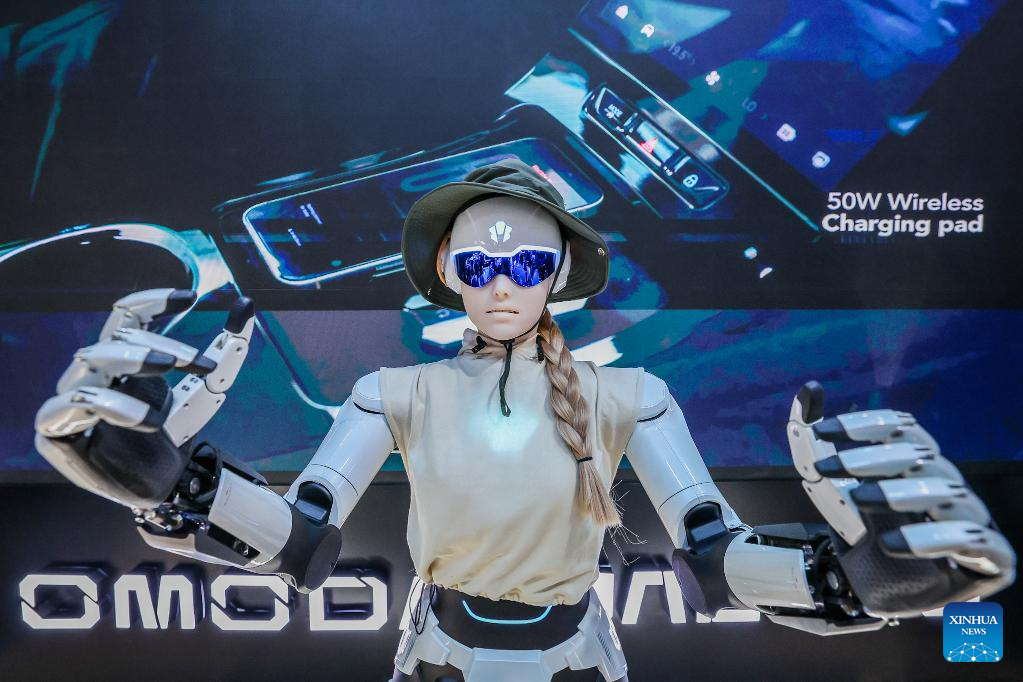 An AiMOGA humanoid robot from Chery is seen during the Manila International Auto Show at the World Trade Center in Pasay City, the Philippines, on April 9, 2026. The auto show takes place from April 9 to 12, showcasing the newest cars from automotive brands around the globe. (Xinhua/Rouelle Umali)