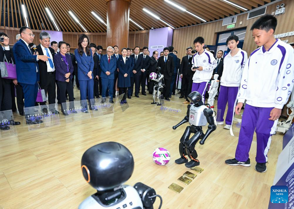 The delegation's first stop was Tsinghua University High School, where they learned about the application of AI in teaching. In school laboratories, the delegation watched student-developed projects including robot football matches, robotic dogs and robotic arms.