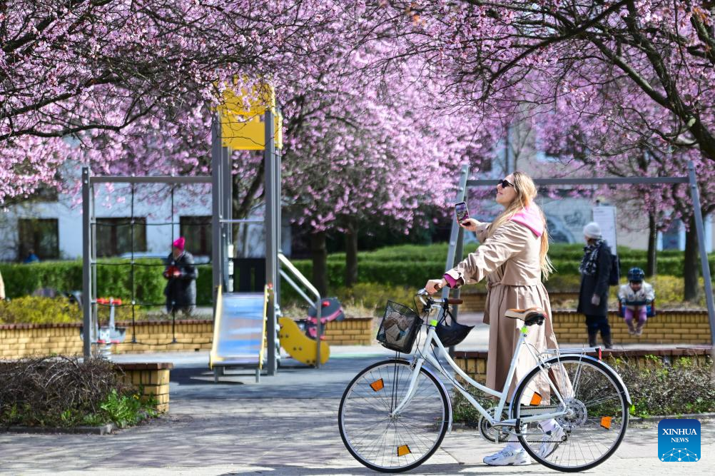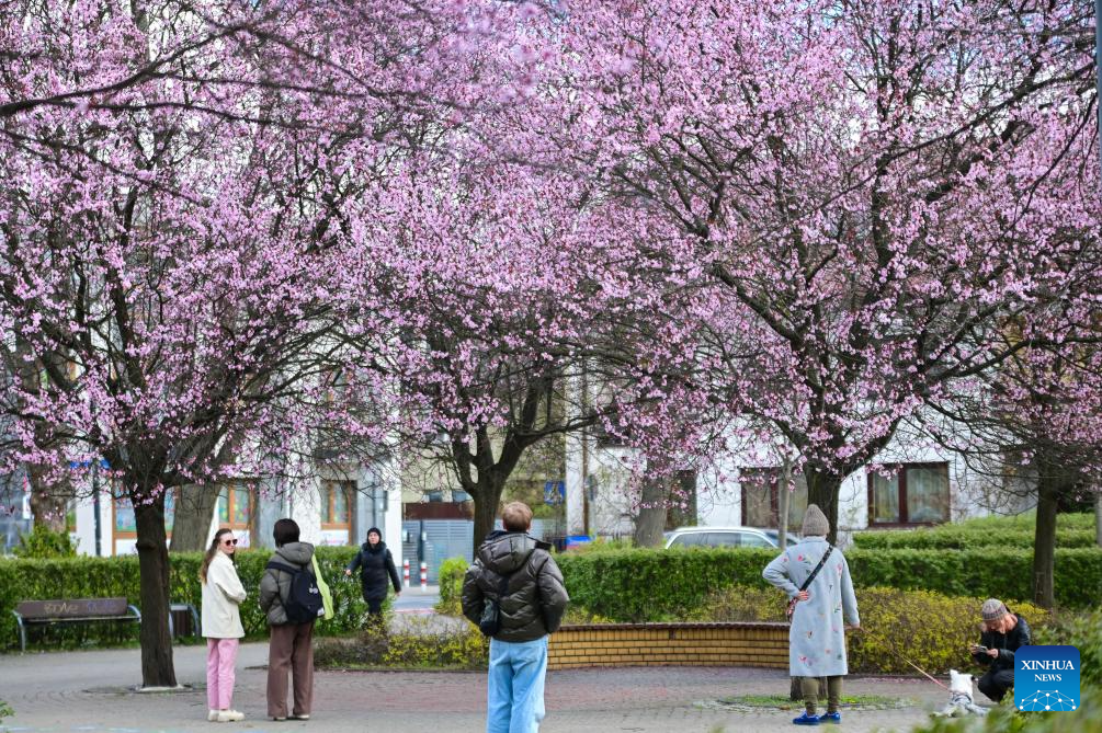 People enjoy cherry blossoms in Warsaw, Poland, on April 10, 2026. (Photo by Aleksy Witwicki/Xinhua)