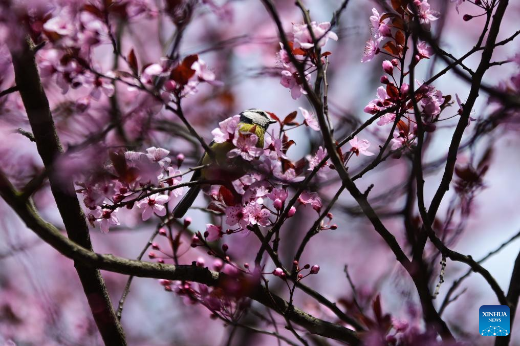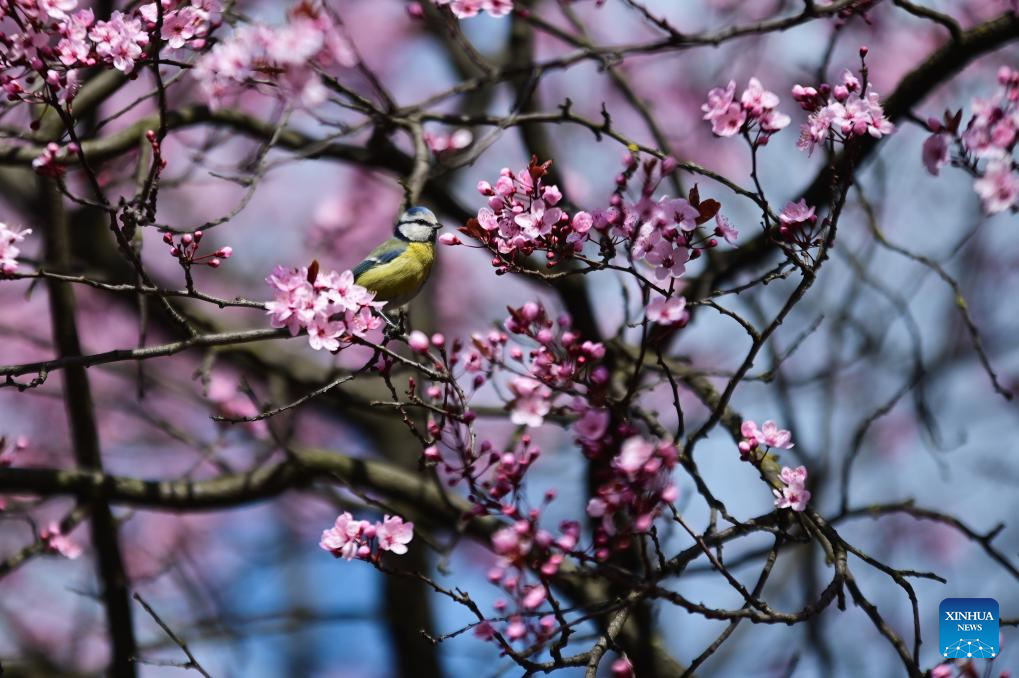 A bird perches on a cherry branch in Warsaw, Poland, on April 10, 2026. (Photo by Aleksy Witwicki/Xinhua)
