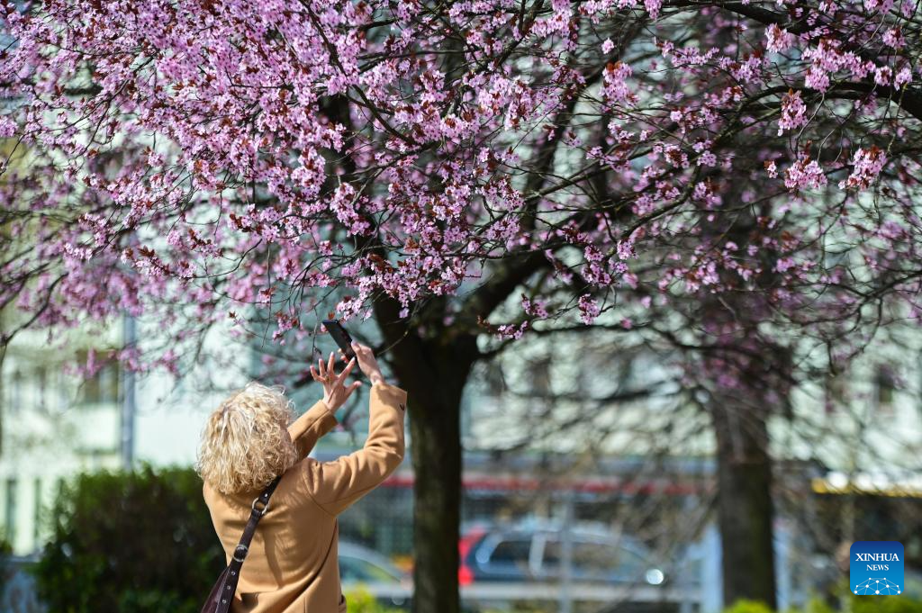 A pedestrian takes photos under blooming cherry trees in Warsaw, Poland, on April 10, 2026. (Photo by Aleksy Witwicki/Xinhua)