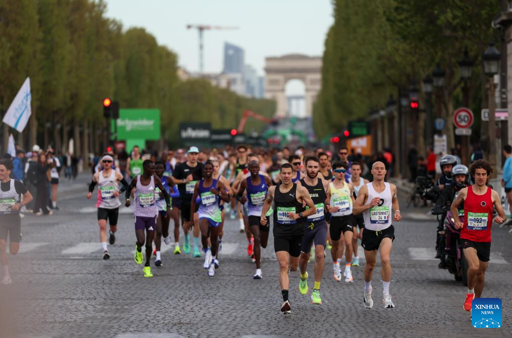 Participants run across Champs-Elysees Avenue during the Paris Marathon 2026 in Paris, France, April 12, 2026. (Xinhua/Wu Huiwo)