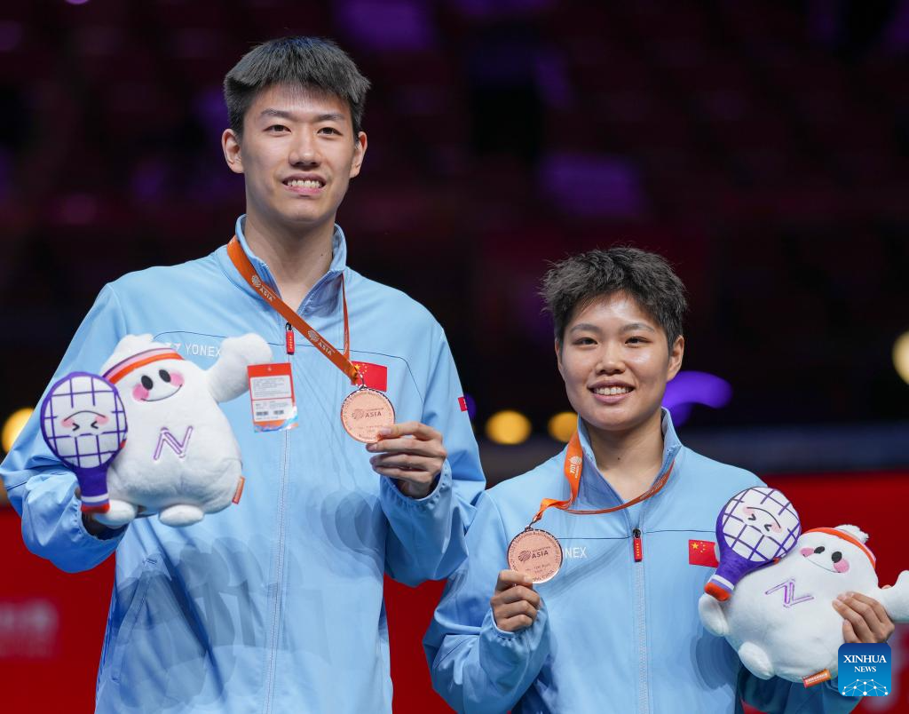 Third-placed Feng Yanzhe (L)/Huang Dongping of China pose for photograph during the mixed doubles awarding ceremony at the Badminton Asia Championships 2026 in Ningbo, east China's Zhejiang Province, April 12, 2026. (Xinhua/Sun Fei)