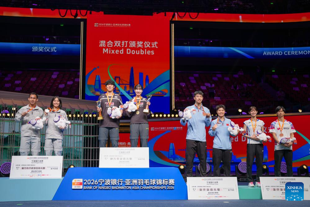First-placed Kim Jae Hyeon (3rd L)/Jang Ha Jeong (4th L) of South Korea, second-placed Dechapol Puavaranukroh (1st L)/Supissara Paewsampran (2nd L) of Thailand, third-placed Feng Yanzhe (4th R)/Huang Dongping (3rd R) of China and Watanabe Yuta (1st R)/Taguchi Maya of Japan pose for photograph during the mixed doubles awarding ceremony at the Badminton Asia Championships 2026 in Ningbo, east China's Zhejiang Province, April 12, 2026. (Xinhua/Sun Fei)
