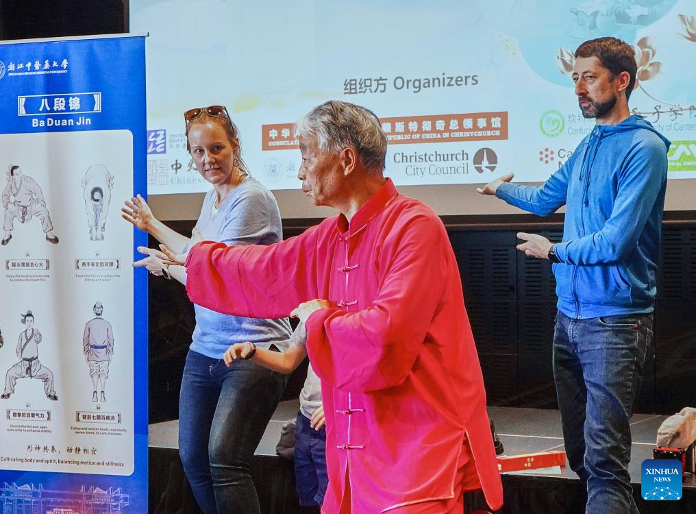 Visitors learn Baduanjin, a traditional Chinese breathing and stretching exercise, at the "Chinese + TCM" South Island Roadshow in Christchurch, New Zealand, April 11, 2026. The "Chinese + TCM (traditional Chinese medicine)" South Island Roadshow was held here on Saturday. A team from Zhejiang Chinese Medical University engaged local audiences with lectures, interactive demonstrations and hands-on activities during the event. (Photo by Chen Siyumeng/Xinhua)