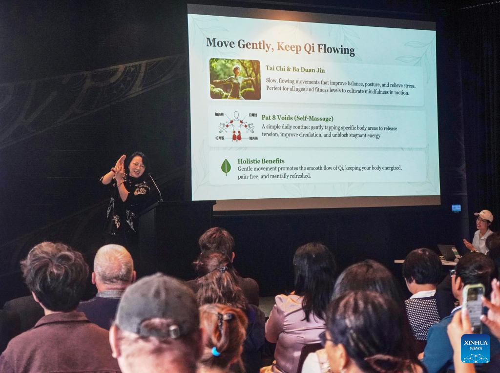 An expert from Zhejiang Chinese Medical University gives a lecture at the "Chinese + TCM" South Island Roadshow in Christchurch, New Zealand, April 11, 2026. The "Chinese + TCM (traditional Chinese medicine)" South Island Roadshow was held here on Saturday. A team from Zhejiang Chinese Medical University engaged local audiences with lectures, interactive demonstrations and hands-on activities during the event. (Photo by Chen Siyumeng/Xinhua)