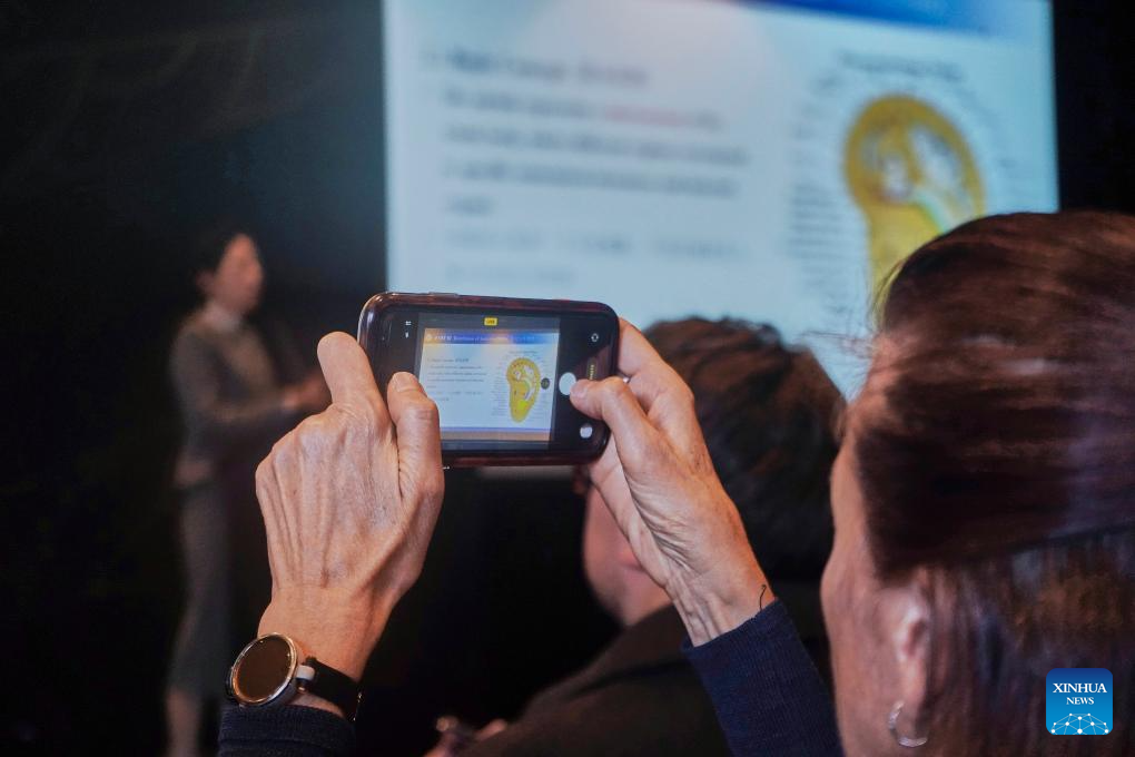 An audience takes photos of a screen display at the "Chinese + TCM" South Island Roadshow in Christchurch, New Zealand, April 11, 2026. The "Chinese + TCM (traditional Chinese medicine)" South Island Roadshow was held here on Saturday. A team from Zhejiang Chinese Medical University engaged local audiences with lectures, interactive demonstrations and hands-on activities during the event. (Photo by Chen Siyumeng/Xinhua)