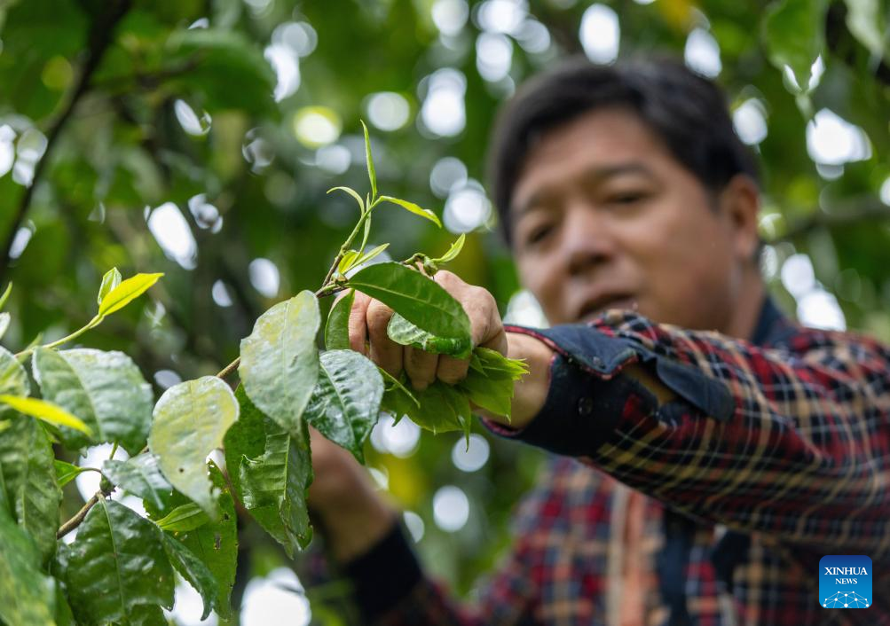 A tea farmer picks tea buds from an ancient tea tree in Chashu Village of Nanchuan District, southwest China's Chongqing Municipality on April 11, 2026. Tea farmers and enterprises are busy harvesting and processing spring tea leaves to meet the consumer demand lately. (Photo by Luo Chuan/Xinhua)