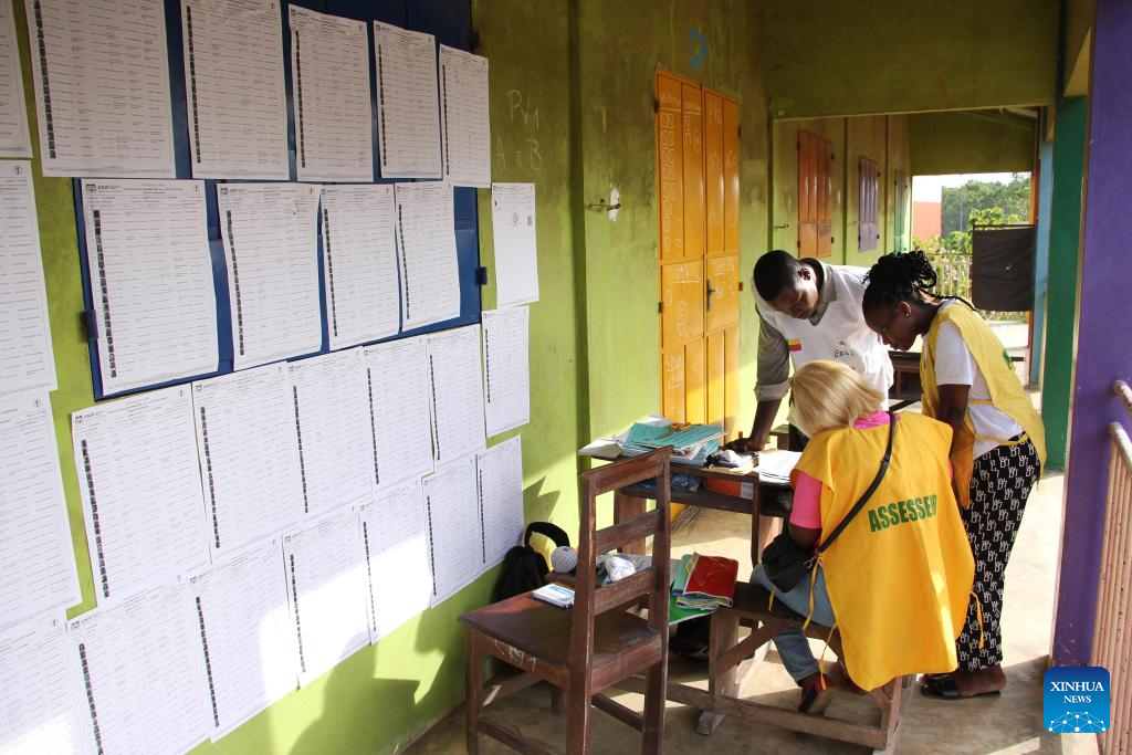 Staff members count ballots at a polling station in Cotonou, Benin, April 12, 2026. Vote counting for the first round of Benin's presidential election began Sunday following the closure of polling stations, Xinhua observed in Cotonou, the country's economic capital. (Photo by Seraphin Zounyekpe/Xinhua)