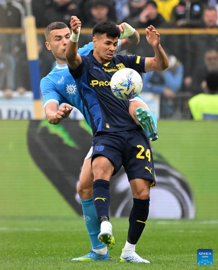 Napoli's Alessandro Buongiorno (L) vies with Parma's Christian Ordonez during a Serie A football match between Parma and Napoli in Parma, Italy, April 12, 2026. (Photo by Alberto Lingria/Xinhua)