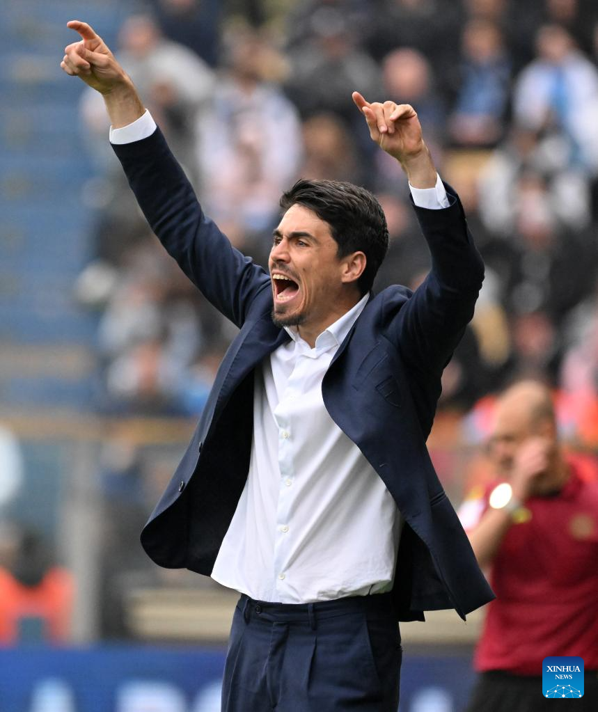 Parma's head coach Carlos Cuestas reacts during a Serie A football match between Parma and Napoli in Parma, Italy, April 12, 2026. (Photo by Alberto Lingria/Xinhua)