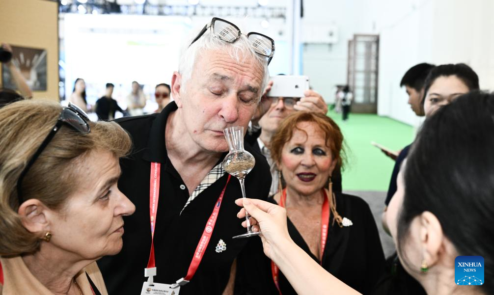 A visitor learns about an agarwood product during the sixth China International Consumer Products Expo (CICPE) in Haikou, south China's Hainan Province, April 13, 2026. Jointly hosted by China's Ministry of Commerce and the Hainan provincial government, the sixth CICPE marks the first edition of the event since the Hainan Free Trade Port fully launched island-wide special customs operations.