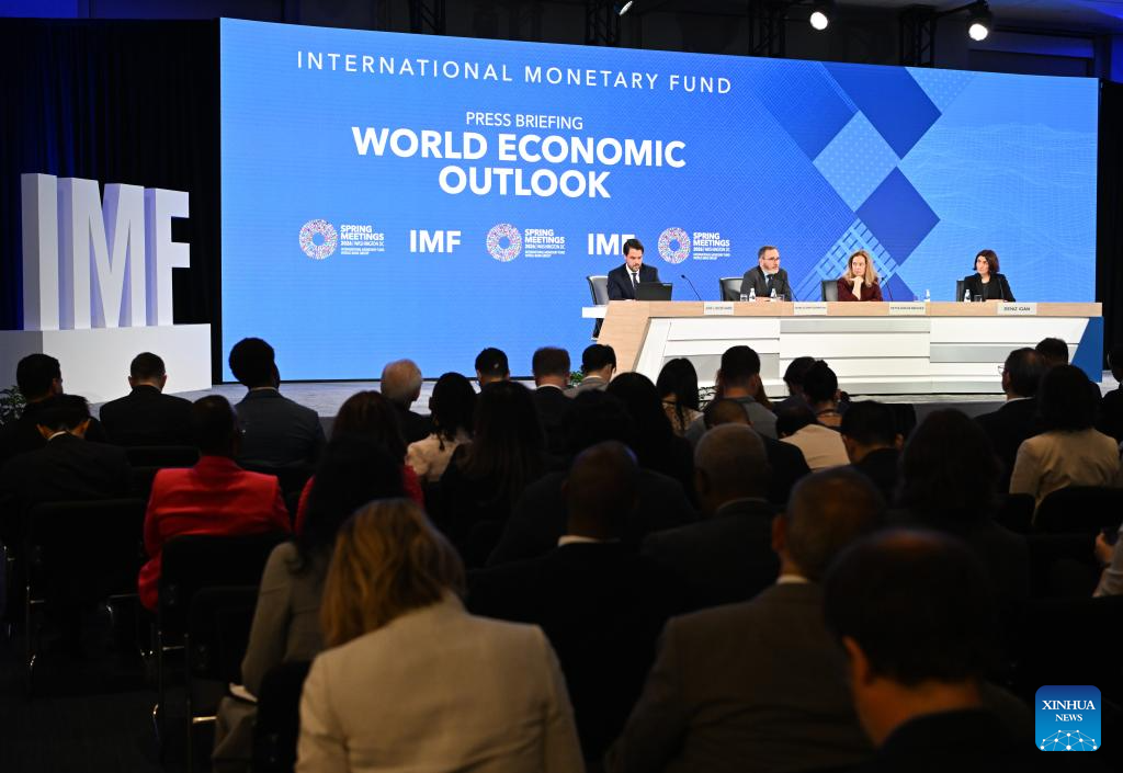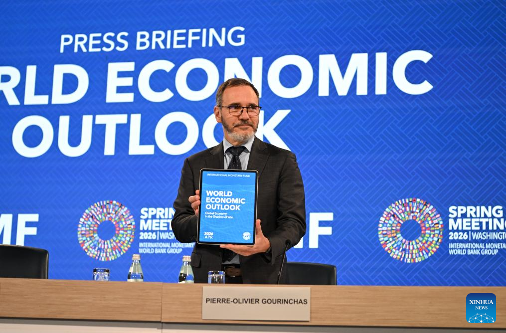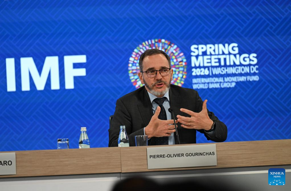 The International Monetary Fund (IMF) chief economist Pierre-Olivier Gourinchas (C) speaks at a press briefing on the latest World Economic Outlook in Washington, D.C., the United States, April 14, 2026. IMF lowered its global economic growth forecasts for 2026 to 3.1 percent in the World Economic Outlook (WEO) report published on Tuesday, while keeping its projection for 2027 at 3.2 percent. (Xinhua/Li Rui)
