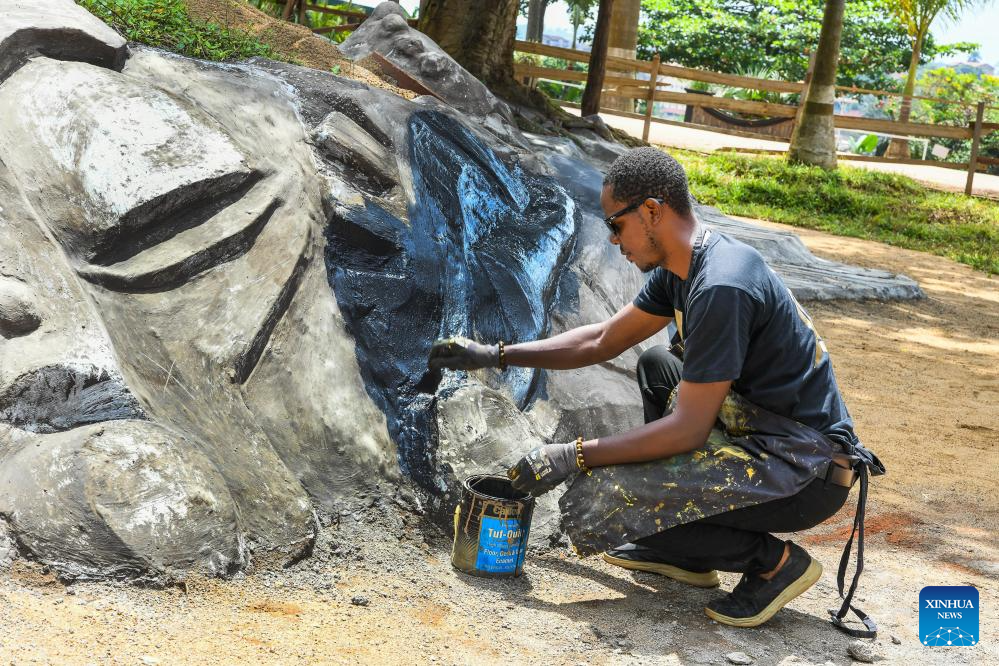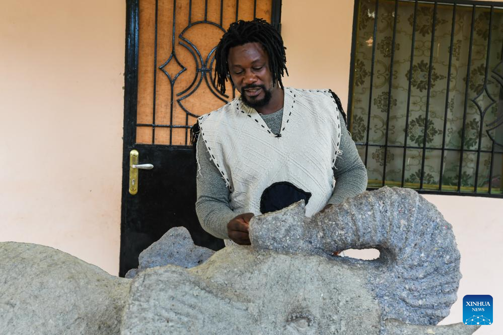 Sculptor Francky Mpando works on an elephant sculpture at his workshop in Yaounde, Cameroon, April 13, 2026. World Art Day falls on April 15 every year. (Photo by Kepseu/Xinhua)