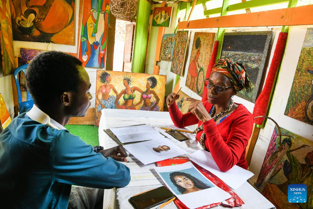 This photo taken on April 13, 2026 shows artist Elise Sidonie Fotso instructing a student at her workshop in Yaounde, Cameroon. World Art Day falls on April 15 every year. (Photo by Kepseu/Xinhua)