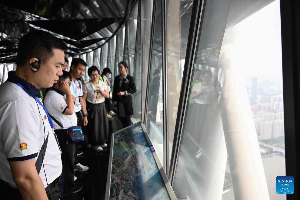 Members of a "Red Study Tours" program from Vietnam visit Canton Tower in Guangzhou, south China's Guangdong Province, April 13, 2026. For many young Vietnamese participants, the "Red Study Tours" across China are far more than a sightseeing trip, offering instead a journey through shared revolutionary history and fresh inspiration for the younger generation.