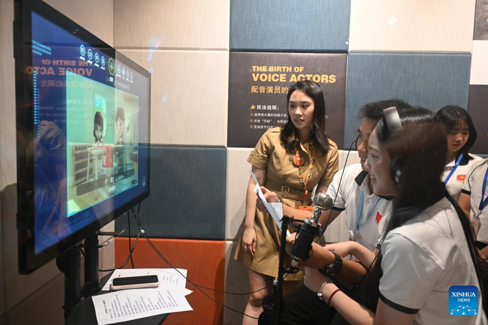 Members of a "Red Study Tours" program from Vietnam experience voice acting at an animation company in Guangzhou, south China's Guangdong Province, April 13, 2026. For many young Vietnamese participants, the "Red Study Tours" across China are far more than a sightseeing trip, offering instead a journey through shared revolutionary history and fresh inspiration for the younger generation.