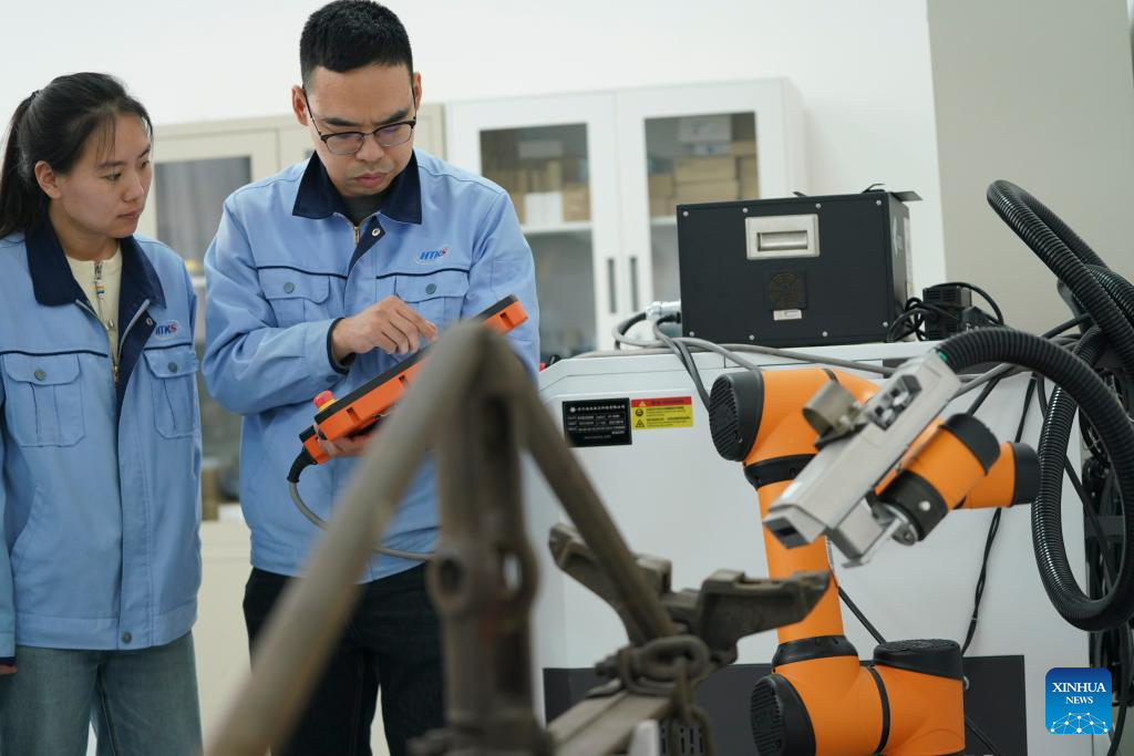 A robot conducts maintenance work at a workshop of China Railway Harbin Bureau Group Co., Ltd. in Harbin, northeast China's Heilongjiang Province, April 15, 2026.