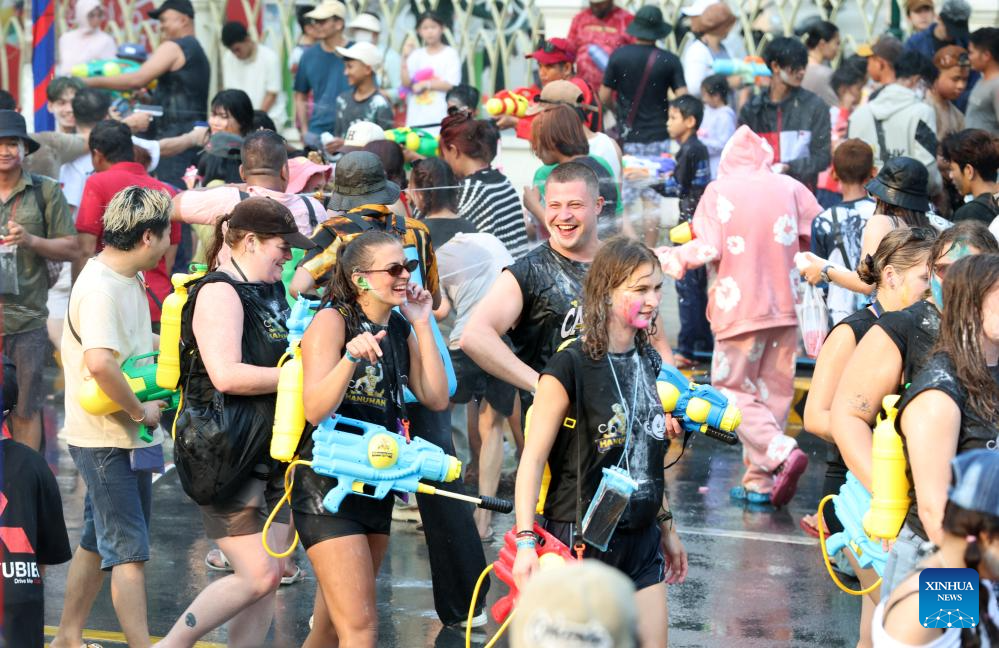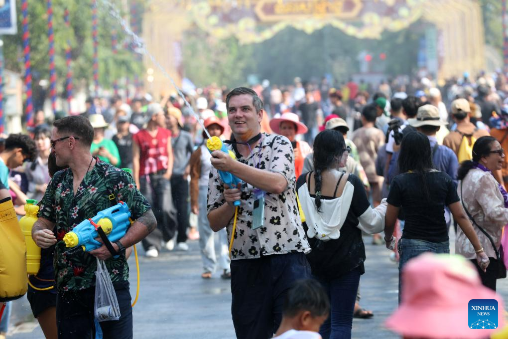 Tourists participate in a water-splashing event on the second day of celebrations of Cambodia's traditional New Year at the Wat Phnom historical site in Phnom Penh, Cambodia, April 15, 2026. (Photo by Sovannara/Xinhua)