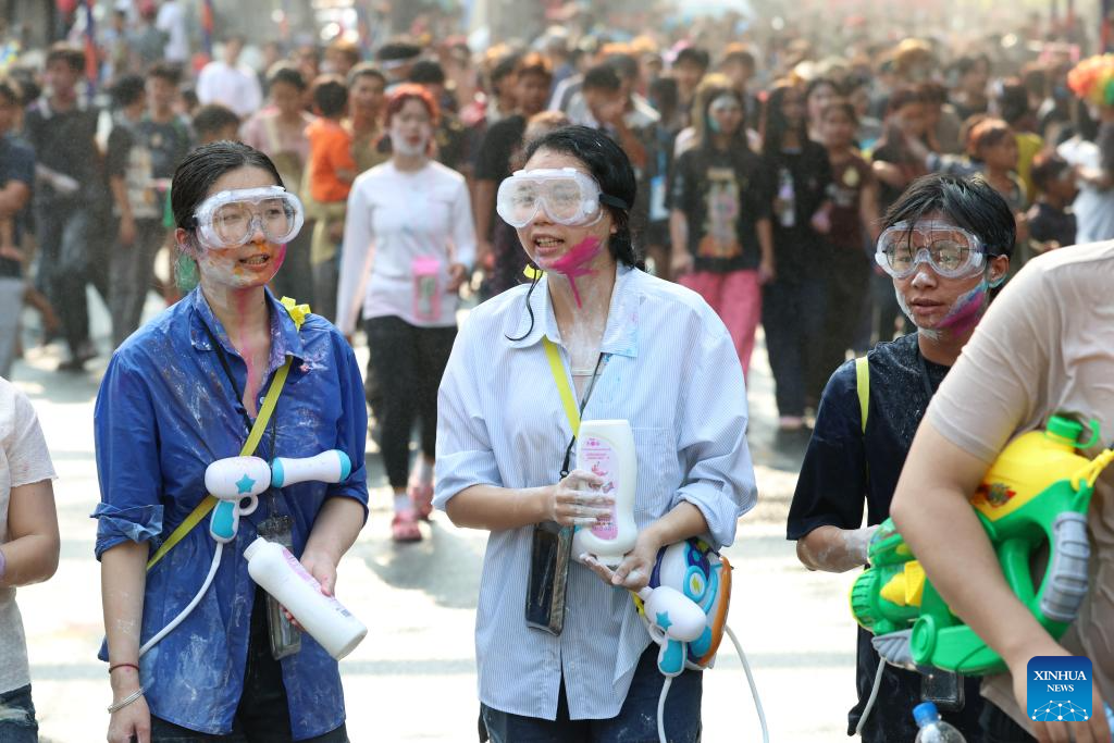 People participate in a water-splashing event on the second day of celebrations of Cambodia's traditional New Year at the Wat Phnom historical site in Phnom Penh, Cambodia, April 15, 2026. (Photo by Sovannara/Xinhua)