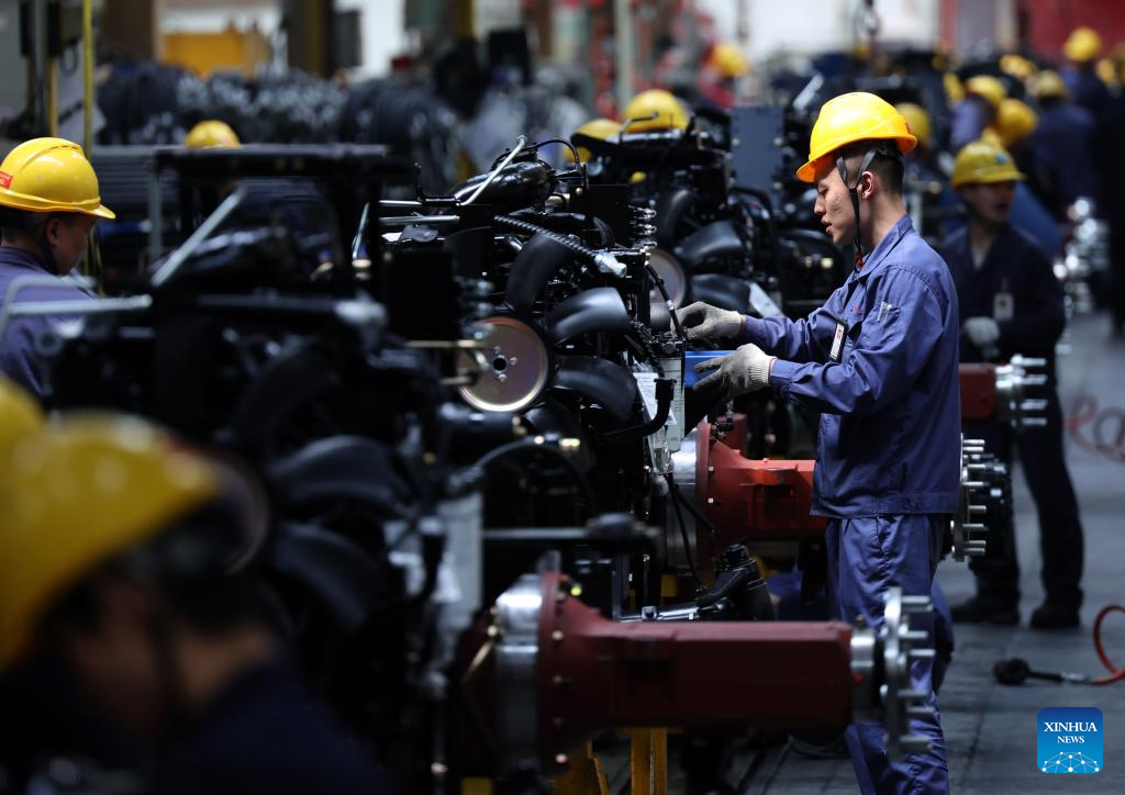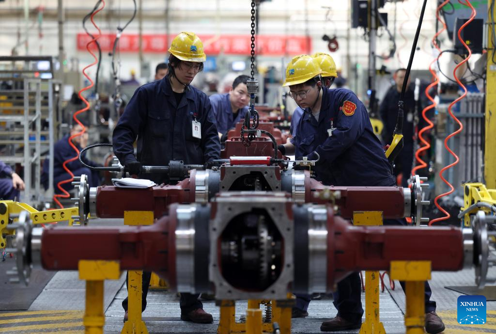 Employees work at an assembly line of China Yituo Group Co., Ltd. in Luoyang, central China's Henan Province, April 14, 2026.
