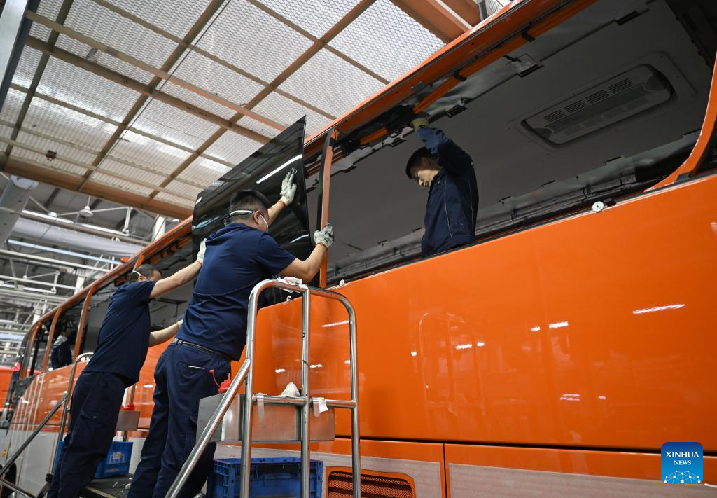 Staff members work on a production line at a factory of Yutong Group in Zhengzhou, central China's Henan Province, March 30, 2026.