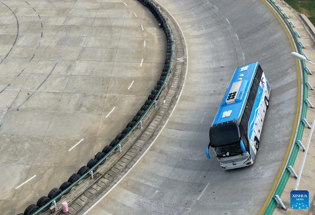 A drone photo taken on March 30, 2026 shows a bus being tested at a factory of Yutong Group in Zhengzhou, central China's Henan Province.