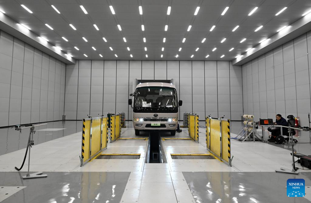 Technicians work at a noise testing lab of Yutong Group in Zhengzhou, central China's Henan Province, March 30, 2026.